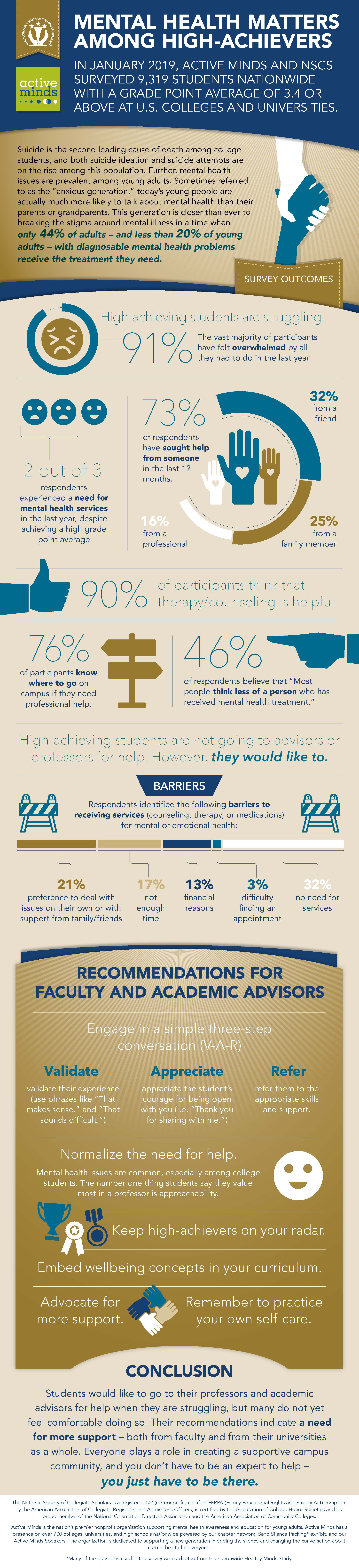 Key findings from a recent survey by Active Minds and The National Society of Collegiate Scholars (NSCS) of 9,319 academically high-achieving college students nationwide illustrate the unique needs of these students, and how their universities can better support their mental health while on campus. This comes at a time when depression, anxiety, and suicidal thoughts are on the rise among college students, according to the national Healthy Minds Study and National College Health Assessment (NCHA).