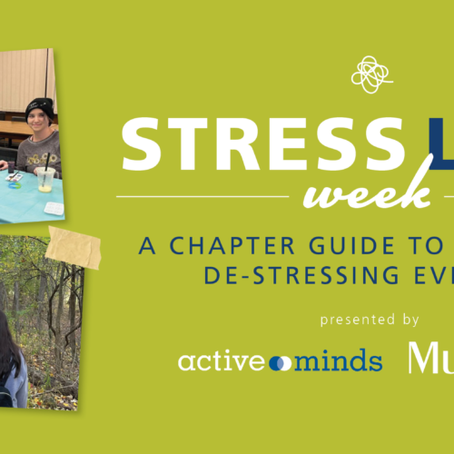 Twice a year, in the fall and spring, Active Minds hosts Stress Less Week®, a time to spotlight education and resources on stress and anxiety as it pertains to young adults across the country. However, the true highlight of this week is the student’s involvement in Stress Less Week and their Chapter events. This year, Stress Less Week takes place from April 24–28, and we encourage you to plan an event (or a couple!) that brings your community together and inspires those around you to actively manage their stress.