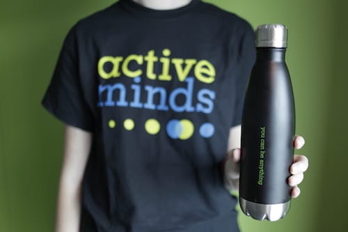Represent Active Minds on your campus with this classic t-shirt + water bottle combo. A refreshing message on your water bottle serves as a constant reminder:Â You can be anything. This bundle is only available for a limited time, get yours today!