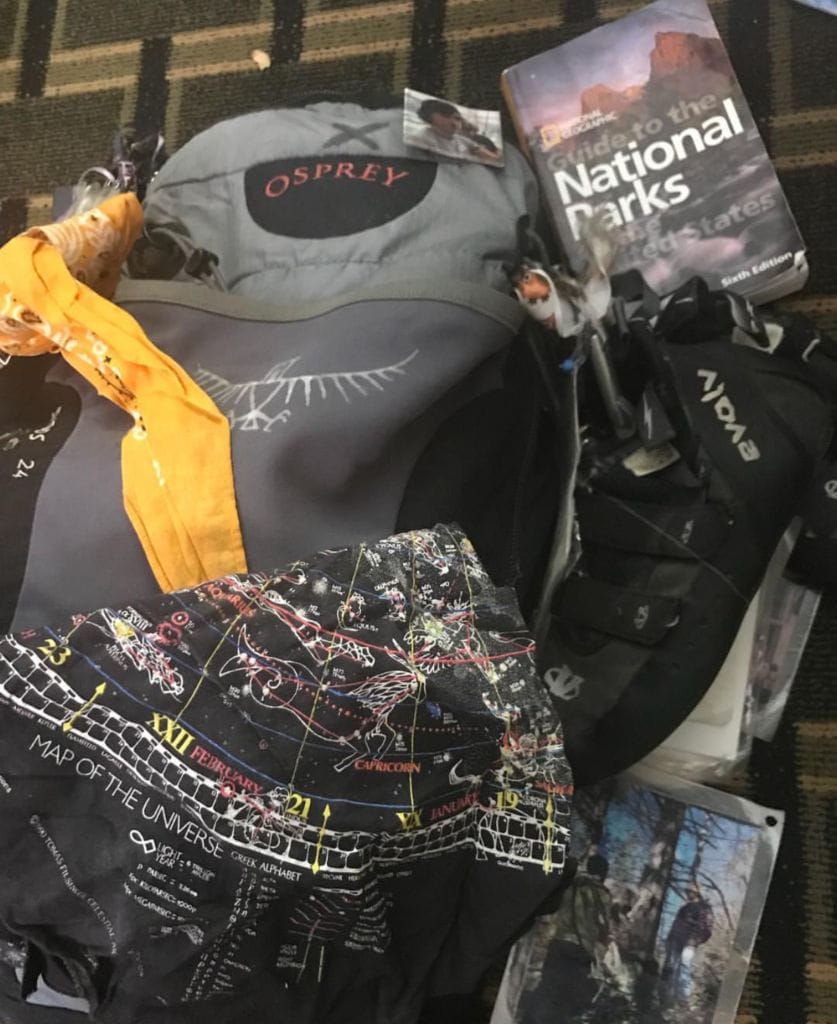 While I can relate to every single story on the backpacks, some really stick with me in particular. This is the due to the fact that there are a vast amount of similarities between myself and the individual. I can’t help to imagine us being very good friends and somehow, connected in a way that can’t be put into words. Several times, Jay’s backpack has been the first one I’ve pulled out during set-up of the display. It is his hiking pack with climbing shoes, a book on National Parks, an Aldous Huxley book (ironically one of the last I’ve yet to read). I’m convinced that I’ve been to a few of the spots Jay and his friends are at in pictures. He also lived with bipolar disorder. We would have gotten along real well.
