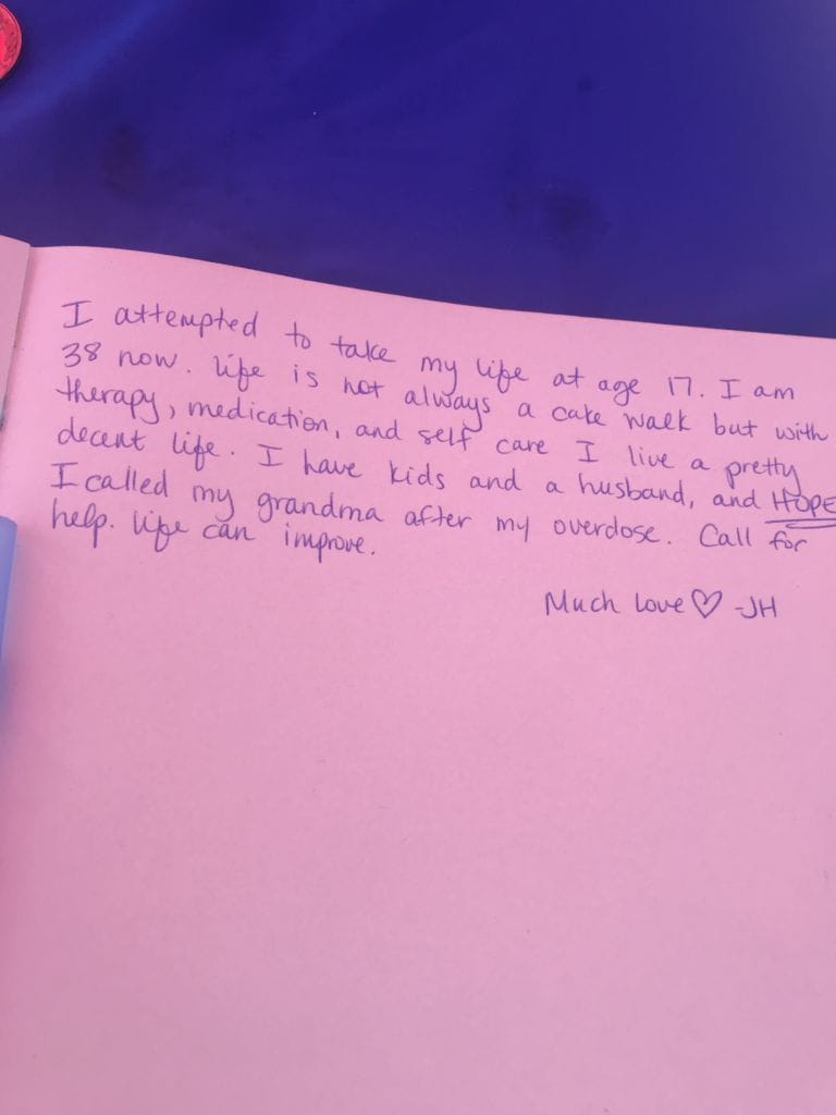 I have returned to my home base and reflect back on the fall tour. 14 college campuses and a whole lot of action. We witness the rawest of human emotions and I am incredibly grateful for this experience. The most common thread is that we all have been effected by suicide to some extent, and we ALL go through spouts of depression, anxiety or the mind not being at ease. Over and over again I hear, “this is not spoken of enough.” The display is a safe space for each and every one of us to share our stories. It is a space for everyone to regain their power, to break free from what we have been conditioned to believe.